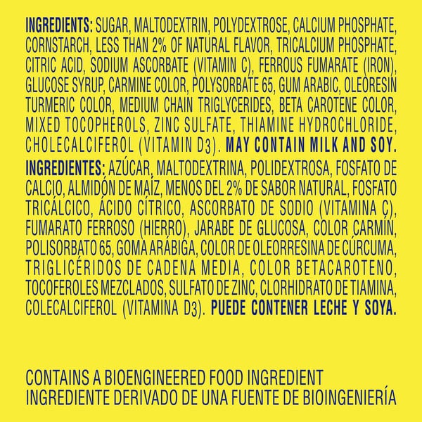 Ingredients: Sugar, Maltodextrin, Polydextrose, Calcium Phosphate, Cornstarch Less Than 1% Of Natural Flavor, Carmine Color. Citric Acid, Stevia Leaf Extract, Sodium Ascorbate (vitamin C), Ferrous Fumarate (iron). Turmeric Oleoresin Color, Beta-carotene Color, Zinc Sulfate, Thiamine Hydrochloride. Vitamin D3.