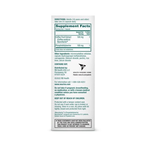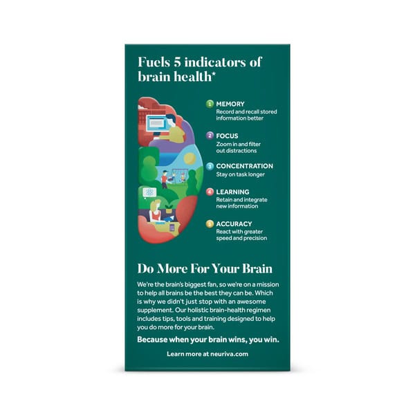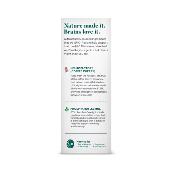 Clinically proven. Naturally sourced Ingredients (Coffee cherry & plant sourced sharp ps). Schiff since 1936. Anti-theft package. Fuels 5 indicators of brain performance. Focus. Memory. Learning. Accuracy. Concentration. Nature made it. Science proved it. Brains love it. Our natural ingredients are GMO-free and clinically proven to help support brain performance. Disclaimer: Neuriva won’t make you a genius, but others might think you are. Neurofactor. (Coffee Cherry): Made from the nutrient-rich fruit of coffee cherry, this whole fruit extract is decaffeinated and clinically proven to increase levels of the vital neuroprotein BDNF, known to strengthen connections between brain cells. Plant-Sourced Sharp PS (Phosphatidylserine): 60% of our brains weight is lipids. Lipids are essential for proper brain function and our plant sourced sharp PS is a phospholipid that is clinically proven to support memory and learning. Neurovia is: Decaffeinated; GMO-free; Vegetarian. Fuels 5 indicators of brain performance. 1. Focus: Zoom in and filter out distractions. 2. Memory: Record and recall stored information better. 3. Learning: Retain and integrate new information. 4. Accuracy, React with greater speed and precision. 5. Concentration: Stay on task longer. Brain Better with Neuriva. We’re the brain’s biggest fan, so we’re on a mission to help all brains be the best they can be. Which is why we didn’t just stop with an awesome supplement. Our holistic brain-health regimen includes tips, tools and training designed to help you brain better. Because when your brain wins, you win. Health. Hygiene. Home.