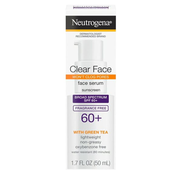 • Neutrogena Clear Face Serum with green tea and broad spectrum SPF 60+ to help prevent sunburn