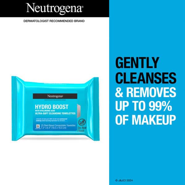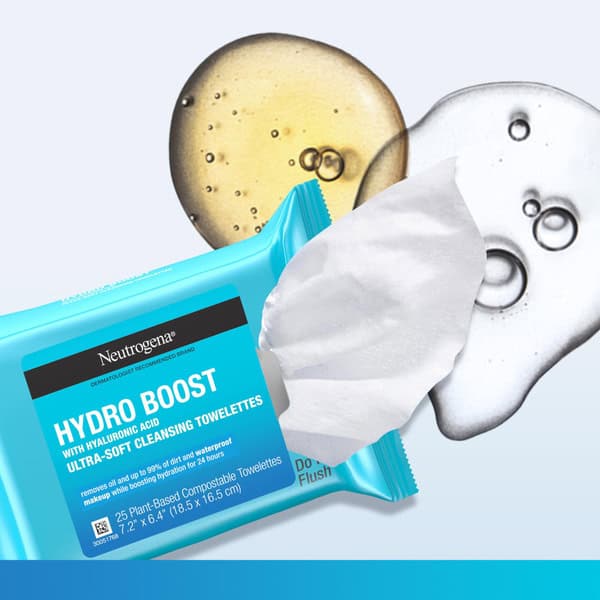 • Neutrogena Hydro Boost Ultra-Soft Facial Cleansing Wipes + hyaluronic acid to cleanse & hydrate skin