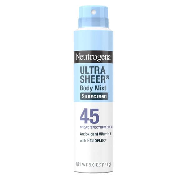 Neutrogena Ultra Sheer Body Mist Sunscreen Spray with Broad Spectrum SPF 45 provides powerful sun protection that you will love to wear to help prevent sunburn. Formula is Oxybenzone-free, Hawaii Act 104 compliant. With Helioplex technology, this non-greasy body sunscreen provides superior UVA/UVB protection in an easy-to-use spray format. The sun screen formula also absorbs quickly with a sheer, ultralight finish and a weightless, clean feel. This SPF 45 spray sunscreen is non-comedogenic and oil-free, so it won’t leave a heavy residue or clog pores. When used as directed with other sun protection measures, may decrease the risk of skin cancer caused by the sun. Convenient and easy-to-use sunscreen spray can provide no-mess application for face and body. Dermatologist recommended sun care brand, Neutrogena sunscreen is water-resistant for up to 80 minutes. Apply prior to sun exposure to keep skin protected during outdoor activities like gardening, biking, hiking, boating or walking.