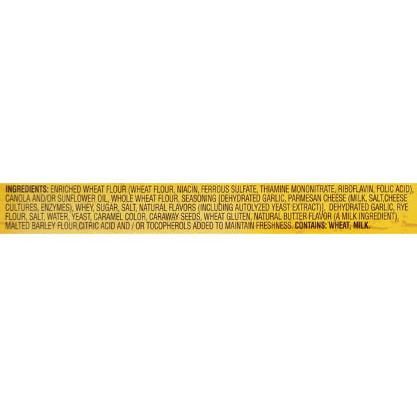 Enriched Wheat Flour (wheat Flour, Niacin, Ferrous Sulfate, Thiamine Mononitrate, Riboflavin, Folic Acid), Canola And/or Sunflower Oil, Whole Wheat Flour, Seasoning [dehydrated Garlic, Parmesan Cheese (milk, Salt, Cheese Cultures, Enzymes), Whey, Sugar, Salt, Natural Flavors (including Autolyzed Yeast Extract)], Dehydrated Garlic, Rye Flour, Salt, Water, Yeast, Caramel Color, Caraway Seeds, Wheat Gluten, Natural Butter Flavor (a Milk Ingredient), Malted Barley Flour, Citric Acid And / Or Tocopherols Added To Maintain Freshness.