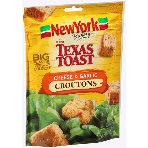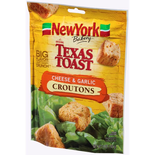 Hearth-baked to seal in rich flavors, New York Bakery Texas Toast Cheese and Garlic Croutons add depth to your salads and soups. Stop settling for plain croutons with virtually no taste. Our recipes deliver crispy, crunchy texture with ample seasoning to give your meals an instant upgrade. Discover full flavor with a satisfying crunch accompanying every bite. We even like to enjoy them plain, right out of the bag, for a deliciously convenient snack.