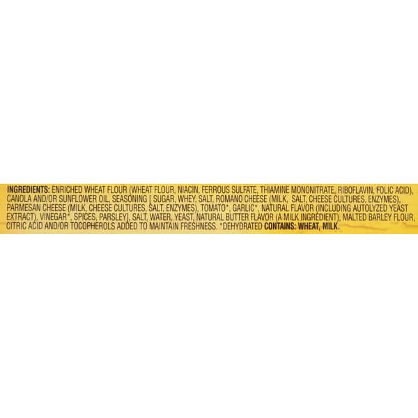 Enriched Wheat Flour (wheat Flour, Niacin, Ferrous Sulfate, Thiamine Mononitrate, Riboflavin, Folic Acid), Canola And/or Sunflower Oil, Seasoning [sugar, Whey, Salt, Romano Cheese (milk, Salt, Cheese Cultures, Enzymes), Parmesan Cheese (milk, Cheese Cultures, Salt, Enzymes), Tomato*, Garlic*, Natural Flavor (including Autolyzed Yeast Extract), Vinegar*, Spices, Parsley], Salt, Water, Yeast, Natural Butter Flavor (a Milk Ingredient), Malted Barley Flour, Citric Acid And/or Tocopherols Added To Maintain Freshness.