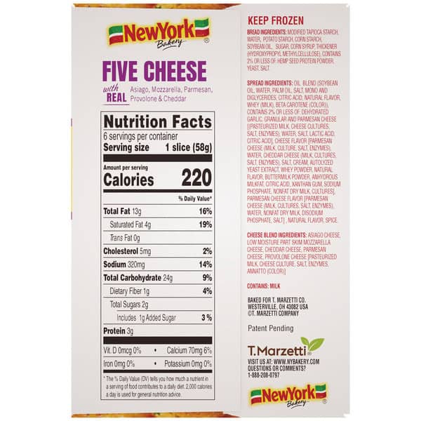 Bread Ingredients: Modified Tapioca Starch, Water, Potato Starch, Corn Starch, Soybean Oil, Sugar, Corn Syrup, Thickener (hydroxypropyl Methylcellulose), Contains 2% Or Less Of: Hemp Seed Protein Powder, Yeast, Salt. Spread Ingredients: Oil Blend (soybean Oil, Water, Palm Oil, Salt, Mono And Diglycerides, Citric Acid, Natural Flavor, Whey (milk), Beta Carotene (color)), Contains 2% Or Less Of: Dehydrated Garlic, Granular And Parmesan Cheese [(pasteurized Milk, Cheese Cultures, Salt, Enzymes), Water, Salt, Lactic Acid, Citric Acid], Cheese Flavor [parmesan Cheese (milk, Culture, Salt, Enzymes), Water, Cheddar Cheese (milk, Cultures, Salt, Enzymes), Salt, Cream, Autolyzed Yeast Extract, Whey Powder, Natural Flavor, Buttermilk Powder, Anhydrous Milkfat, Citric Acid, Xanthan Gum, Sodium Phosphate, Nonfat Dry Milk, Cultures], Parmesan Cheese Flavor [parmesan Cheese (milk, Cultures, Salt, Enzymes), Water, Nonfat Dry Milk, Disodium Phosphate, Salt] , Natural Flavor, Spice. Cheese Blend Ingredients: Asiago Cheese, Low Moisture Part Skim Mozzarella Cheese, Cheddar Cheese, Parmesan Cheese, Provolone Cheese [pasteurized Milk, Cheese Culture, Salt, Enzymes, Annatto (color)]