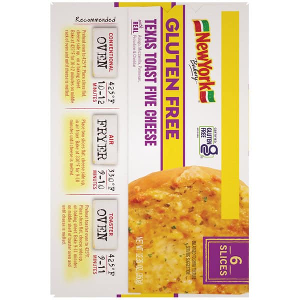 We’re New York Bakery. You may know us as “the toast in the yellow box” or simply “Texas Toast.” And we’ve finally made the Gluten-Free Texas Toast you’ve waited for. Topped with a blend of five real cheeses, our Five Cheese bread is a family staple everyone will love, with the same crispy crust and soft inside as our Original Garlic Texas Toast bread. No one should be left out on Italian night, so grab a box next time you pick up pasta and pasta sauce for a complete meal ready within minutes. Made in a dedicated gluten-free facility, you can feel good about serving this GFCO certified toast as a side or snack.