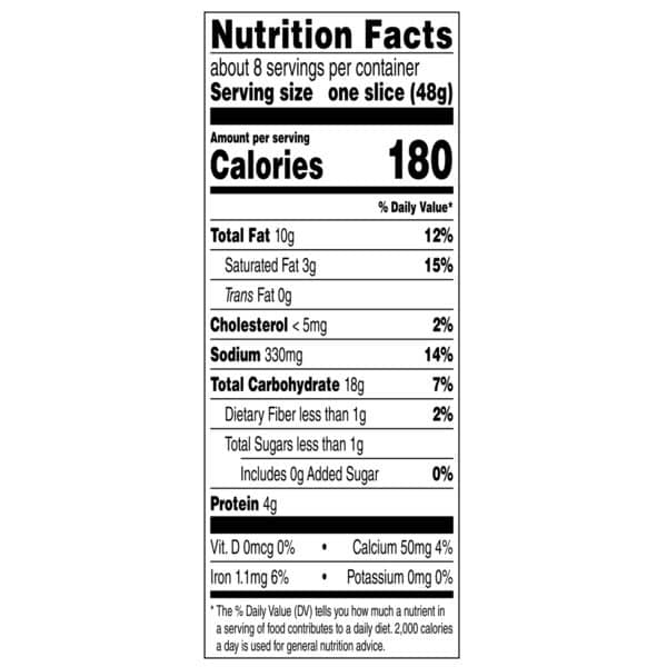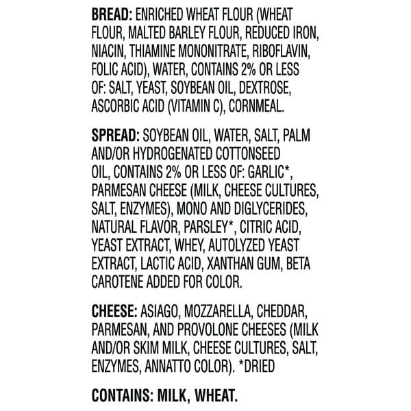 Bread: Enriched Wheat Flour (wheat Flour, Malted Barley Flour, Niacin, Iron, Thiamine Mononitrate, Riboflavin, Folic Acid), Water, Contains 2% Or Less Of: Yeast, Salt, Soybean Oil, Dextrose, Dough Conditioners (datem, Mono And Diglycerides, Calcium Sulfate, Ascorbic Acid, Enzymes), Cornmeal. Spread: Soybean Oil, Water, Palm Oil, Garlic*, Salt, Parmesan Cheese (milk, Cheese Cultures, Salt, Enzymes), Mono And Diglycerides, Parsley*, Citric Acid, Natural And Artificial Flavors, Beta Carotene Added For Color, Autolyzed Yeast Extract, Whey, Lactic Acid, Xanthan Gum. Cheese: Asiago, Mozzarella, Cheddar, Parmesan, And Provolone Cheeses (milk And/or Skim Milk, Cheese Cultures, Salt, Enzymes, Annatto Color).