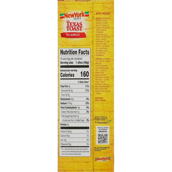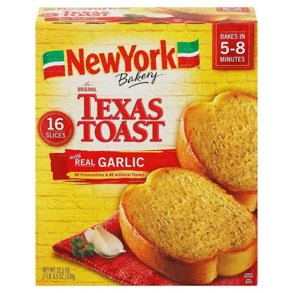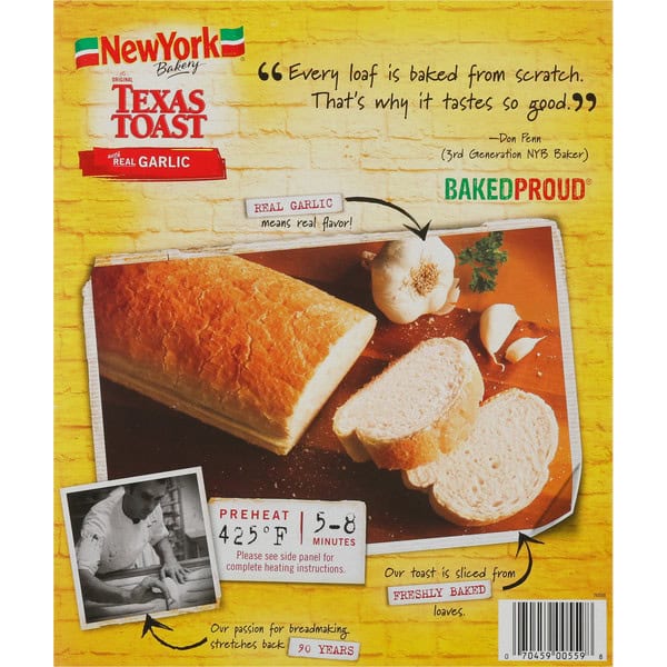 Bakes in 5-8 minutes. The original Texas toast. Every loaf is baked from scratch. That’s why it tastes so good. – Don Penn (3rd Generation NYB Baker). Baked proud. Real garlic means real flavor. Our toast is sliced from freshly baked loaves. Our passion for breadmaking stretches back 90 years.