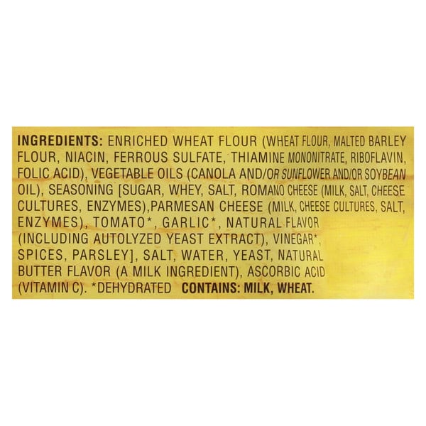 Enriched Wheat Flour (wheat Flour, Niacin, Ferrous Sulfate, Thiamine Mononitrate, Riboflavin, Folic Acid), Canola And/or Sunflower Oil, Seasoning [sugar, Whey, Salt, Romano Cheese (milk, Salt, Cheese Cultures, Enzymes), Parmesan Cheese (milk, Cheese Cultures, Salt, Enzymes), Tomato*, Garlic*, Natural Flavor (including Autolyzed Yeast Extract), Vinegar*, Spices, Parsley], Salt, Water, Yeast, Natural Butter Flavor (a Milk Ingredient), Malted Barley Flour, Citric Acid And/or Tocopherols Added To Maintain Freshness.