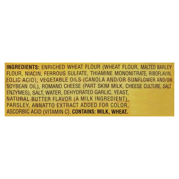 Enriched Wheat Flour (wheat Flour, Niacin, Ferrous Sulfate, Thiamine Mononitrate, Riboflavin, Folic Acid), Canola And/or Sunflower Oil, Romano Cheese (part Skim Milk, Cheese Culture, Salt, Enzymes), Dehydrated Garlic, Salt, Water, Yeast, Parsley, Natural Butter Flavor (a Milk Ingredient), Annatto Extract Added For Color, Malted Barley Flour, Citric Acid And/or Tocopherols Added To Maintain Freshness.