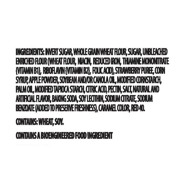 Invert Sugar, Whole Grain Wheat Flour, Sugar, Unbleached Enriched Flour (wheat Flour, Niacin, Reduced Iron, Thiamine Mononitrate {vitamin B1}, Riboflavin {vitamin B2}, Folic Acid), Strawberry Puree, Corn Syrup, Apple Powder, Canola Oil, Modified Cornstarch, Palm Oil, Modified Tapioca Starch, Citric Acid, Pectin, Salt, Natural Flavor, Baking Soda, Soy Lecithin, Sodium Citrate, Sodium Benzoate Added To Preserve Freshness, Caramel Color, Red 40, Artificial Flavor.