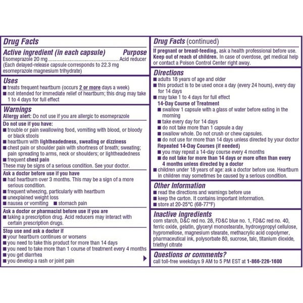Ask a doctor or pharmacist before use if you are taking – warfarin, clopidogrel or cilostazol (blood-thinning medicines), prescription antifungal or anti-yeast medicines, digoxin (heart medicine), diazepam (anxiety medicine), tacrolimus or mycophenolate mofetil (immune system medicines), prescription antiretrovirals (medicines for hiv infection), methotrexate (arthritis medicine). Ask a doctor before use if you have – had heartburn over 3 months. This may be a sign of a more serious condition. Frequent wheezing, particularly with heartburn, unexplained weight loss, nausea or vomiting, stomach pain. Allergy alert: do not use if you are allergic to esomeprazole. Stop use and ask a doctor if – your heartburn continues or worsens, you need to take this product for more than 14 days, you need to take more than 1 course of treatment every 4 months, you get diarrhea. Do not use if you have: trouble or pain swallowing food, vomiting with blood, or bloody or black stools, heartburn with lightheadedness, sweating or dizziness, chest pain or shoulder pain with shortness of breath; Sweating; Pain spreading to arms, neck or shoulders; Or lightheadedness, frequent chest pain, these may be signs of a serious condition. See your doctor. If pregnant or breast-feeding, ask a health professional before use. Keep out of reach of children. In case of overdose, get medical help or contact a poison control center right away.