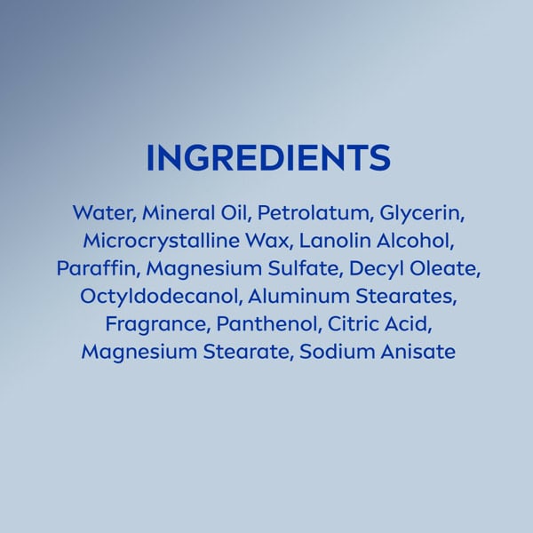 Water, Mineral Oil, Petrolatum, Glycerin, Microcrystalline Wax, Lanolin Alcohol, Paraffin, Magnesium Sulfate, Decyl Oleate, Octyldodecanol, Aluminum Stearates, Fragrance, Panthenol, Citric Acid, Magnesium Stearate, Sodium Anisate