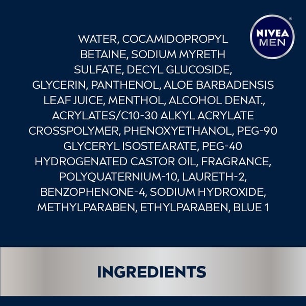 Water, Cocamidopropyl Betaine, Sodium Myreth Sulfate, Decyl Glucoside, Glycerin, Panthenol, Aloe Barbadensis Leaf Juice, Menthol, Alcohol Denat., Acrylates/c10-30 Alkyl Acrylate Crosspolymer, Phenoxyethanol, Peg-90 Glyceryl Isostearate, Peg-40 Hydrogenated Castor Oil, Fragrance, Polyquaternium-10, Laureth-2, Benzophenone-4, Sodium Hydroxide, Methylparaben, Ethylparaben, Blue 1