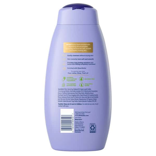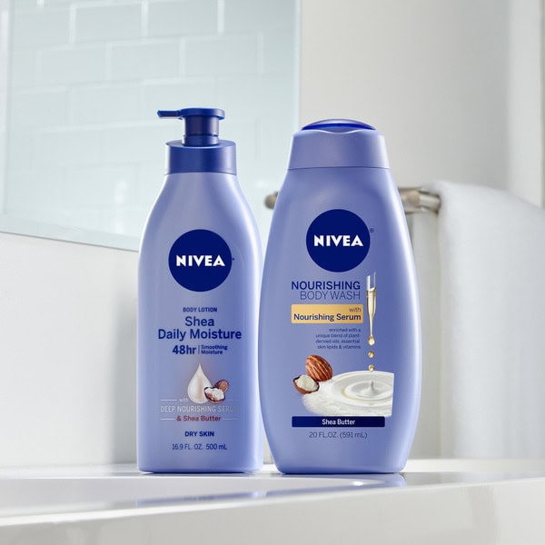 Give your skin the care it deserves with NIVEA Shea Butter Nourishing Body Wash with Nourishing Serum. This body wash provides essential moisture for healthy-looking skin that feels completely nourished. NIVEA Shea Butter Nourishing Body Wash is enriched with a unique blend of plant-derived oils, essential skin lipids, and vitamins, and cares for your skin while gently cleansing. The creamy lather leaves skin feeling soft and smooth, and can also be used as an alternative to shaving cream. This shea butter body wash for dry skin is ideal for everyday use. It is also free of parabens and microplastic particles. This moisturizing body wash is a key part of a skincare routine and pairs well with NIVEA Shea Daily Moisture Body Lotion. To use, apply NIVEA Shea Butter Nourishing Body Wash onto a cleansing pouf, lather onto your body, and rinse off for a refreshed skin feel. NIVEA is a trusted leader in skin care products, with more than 130 years of expertise.
