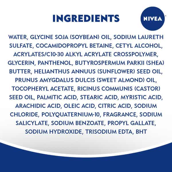 Water, Glycine Soja (soybean) Oil, Sodium Laureth Sulfate, Cocamidopropyl Betaine, Cetyl Alcohol, Acrylates/c10-30 Alkyl Acrylate Crosspolymer, Glycerin, Panthenol, Butyrospermum Parkii (shea) Butter, Helianthus Annuus (sunflower) Seed Oil, Prunus Amygdalus Dulcis (sweet Almond) Oil, Tocopheryl Acetate, Ricinus Communis (castor) Seed Oil, Palmitic Acid, Stearic Acid, Myristic Acid, Arachidic Acid, Oleic Acid, Citric Acid, Sodium Chloride, Polyquaternium-10, Fragrance, Sodium Salicylate, Sodium Benzoate, Propyl Gallate, Sodium Hydroxide, Trisodium Edta, Bht