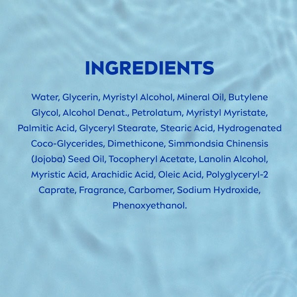 Water, Glycerin, Myristyl Alcohol, Mineral Oil, Butylene Glycol, Alcohol Denat., Petrolatum, Myristyl Myristate, Palmitic Acid, Glyceryl Stearate, Stearic Acid, Hydrogenated Coco-glycerides, Dimethicone, Simmondsia Chinensis (jojoba) Seed Oil, Tocopheryl Acetate, Lanolin Alcohol, Myristic Acid, Arachidic Acid, Oleic Acid, Polyglyceryl-2 Caprate, Fragrance, Carbomer, Sodium Hydroxide, Phenoxyethanol