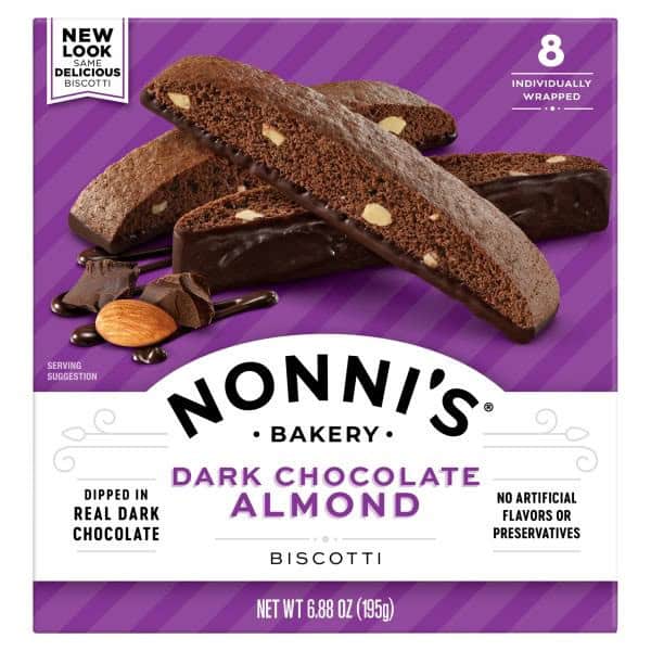 Designed for the chocolate purist. A dark brown chocolate almond biscotti dipped in gourmet bittersweet chocolate creating a delectable combination. Perfect with a cafĂ© mocha, cafĂ© latte, or even a glass of milk. Nonni’s Biscotti are made with real, wholesome ingredients baked by real bakers baked twice for a light, crunchy texture that’s delicately sweet and satisfying. Our Bakers are inspired to follow Nonni’s old world traditions in preparing biscotti using real quality ingredients. Just one taste and you will understand that nobody treats you like Nonni’s.