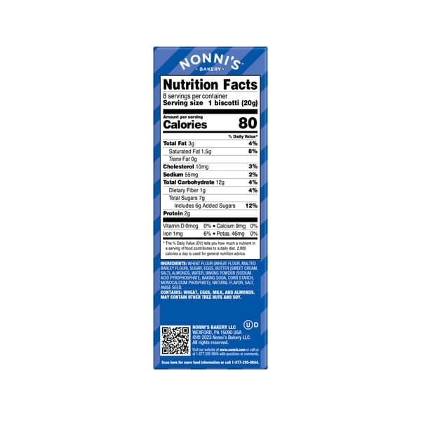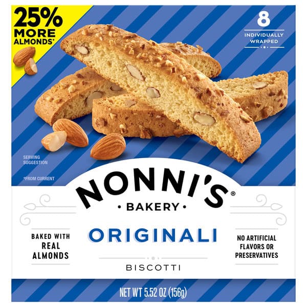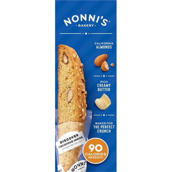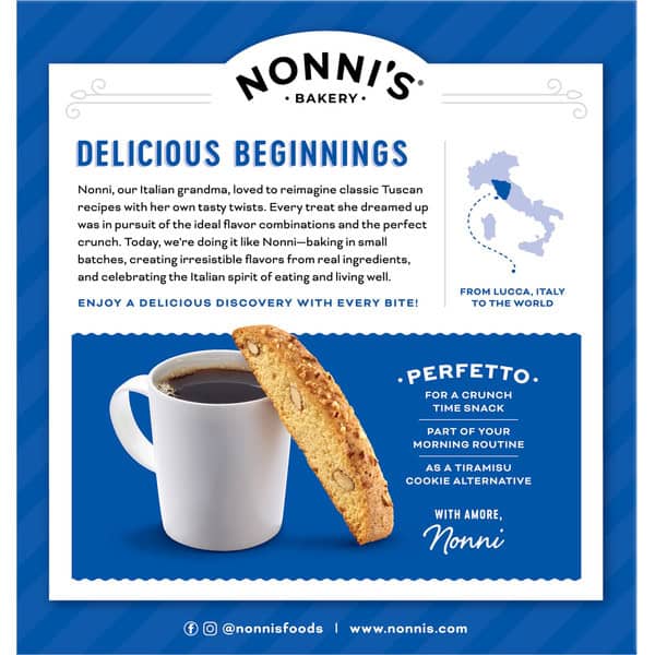 Real, wholesome ingredients. Made with real eggs, sugar, almonds, Dark Chocolate, and butter. Baked twice for a light, crunchy texture that’s delicately sweet and satisfying. Each box contains 8 Artisan Baked Cioccolati Biscottis topped with Almonds and dipped in Real Dark Chocolate which are Individually Wrapped and ready to eat. Artisan Baked, Italian Inspired From Family Tradition to Artisan Bakery Delights. The story of Nonni’s began in the Tuscan town of Lucca, Italy. That’s where our founder’s beloved grandmother known as Nonni first baked her delicious biscotti using only real, hand picked ingredients from her local market. When he opened his artisan bakery in 1988 called Nonni’s, of course he followed his grandmother’s recipes and uncompromising quality standards. Today our bakers are inspired to follow Nonni’s old world traditions in preparing a variety of delicious treats using real quality ingredients. No artificial flavors or preservatives. Just one taste and you will understand that Nobody Treats You Like Nonni’s! Treat yourself to a Nonni’s biscotti break – Just Open and Enjoy!