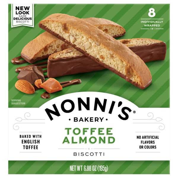 A light crunchy cookie filled with English-style toffee bits, blended with some of the finest almonds available and dipped in rich gourmet milk chocolate. The combination of these three exquisite ingredients creates a taste sensation that is heaven on earth. Nonni’s Biscotti are made with real, wholesome ingredients baked by real bakers baked twice for a light, crunchy texture that’s delicately sweet and satisfying. Our bakers are inspired to follow Nonni’s old world traditions in preparing Biscotti using real quality ingredients. Just one taste and you will understand that nobody treats you like Nonni’s.