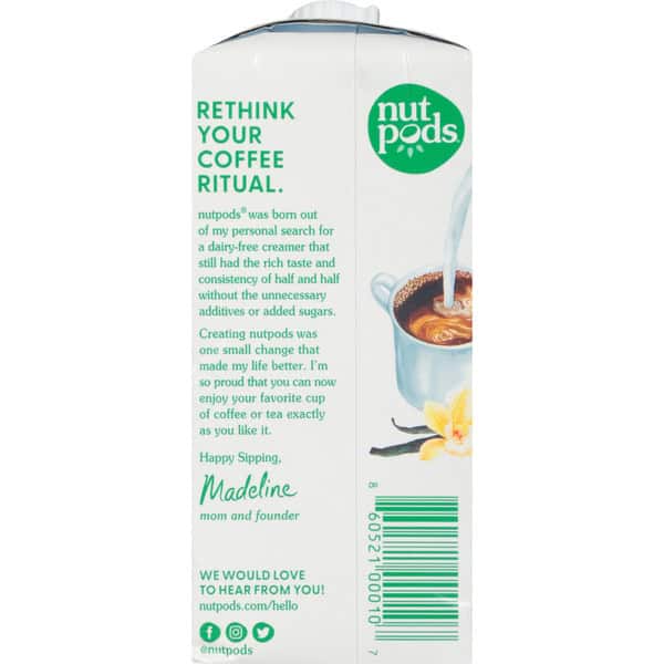 Rethink your coffee ritual. Nutpods was born out of my personal search for a dairy-free creamer that still had the rich taste and consistency of half and half without the unnecessary additives or added sugars. Creating Nutpods was one small change that made my life better. I’m so proud that you can now enjoy your favorite cup of coffee or tea exactly as you like it. Happy Sipping, – Madeline, Mom and Founder. Carrageenan-free. FSC: Mix – Board. Please recycle.
