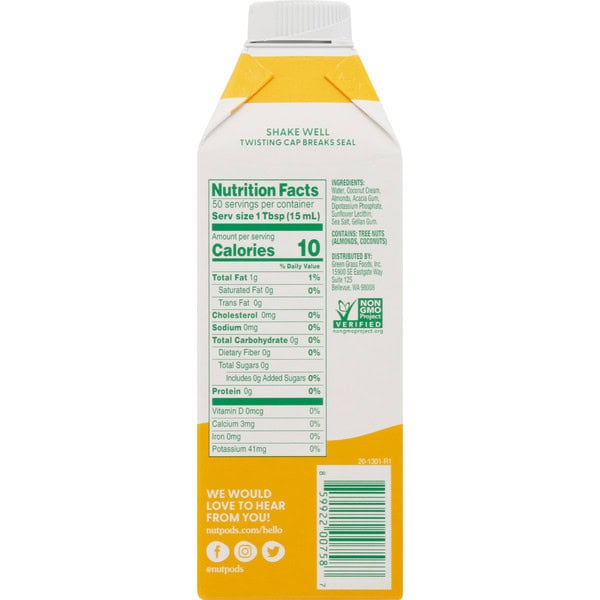Water, Coconut Cream, Almonds, Acacia Gum, Dipotassium Phosphate, Sunflower Lecithin, Sea Salt, Gellan Gum.