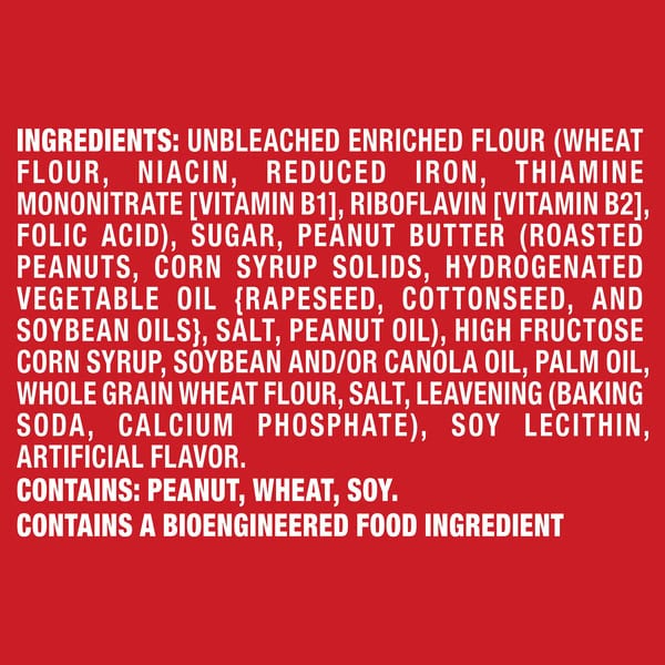 Unbleached Enriched Flour (wheat Flour, Niacin, Reduced Iron, Thiamine Mononitrate [vitamin B1], Riboflavin [vitamin B2], Folic Acid), Sugar, Peanut Butter (roasted Peanuts, Corn Syrup Solids, Hydrogenated Vegetable Oil {rapeseed, Cottonseed, And Soybean Oils}, Salt, Peanut Oil), High Fructose Corn Syrup, Soybean And/or Canola Oil, Palm Oil, Whole Grain Wheat Flour, Salt, Leavening (baking Soda, Calcium Phosphate), Soy Lecithin, Artificial Flavor.