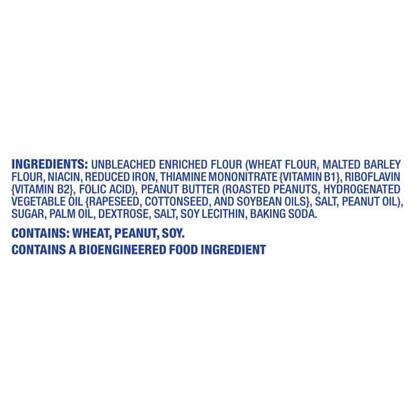Unbleached Enriched Flour (wheat Flour, Malted Barley Flour, Niacin, Reduced Iron, Thiamine Mononitrate {vitamin B1}, Riboflavin {vitamin B2}, Folic Acid), Peanut Butter (roasted Peanuts, Hydrogenated Vegetable Oil {rapeseed, Cottonseed, And Soybean Oils}, Salt, Peanut Oil), Sugar, Palm Oil, Dextrose, Salt, Soy Lecithin, Baking Soda