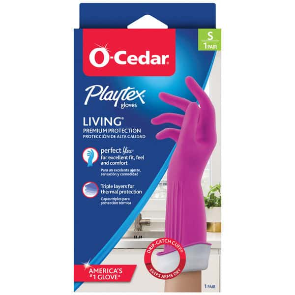 New color. Premium protection. Perfect Flex for excellent fit, feel and comfort. Triple layers for thermal protection. Drip-catch cuff – keeps arms dry. America’s no. 1 reusable glove (based on IRI 52 wks sales ending 7/31/19). New look. Same great glove. With over 100 years of expertise in household cleaning tools, O-Cedar is proud to bring you Playtex Gloves with the same great quality you’ve trusted for years. Premium hand protection during dishwashing and other household chores. Drip-Catch Cuff keeps hands, arms and clothing dry. Ultra-Fresh technology inhibits the growth of odor-causing bacteria, mold and mildew on the glove. Made with a latex/neoprene/nitrile formula for strength and durability. Soft, cotton lining provides comfort and ease of putting on and taking off. Textured palm and fingertips improve grip while handling wet objects.