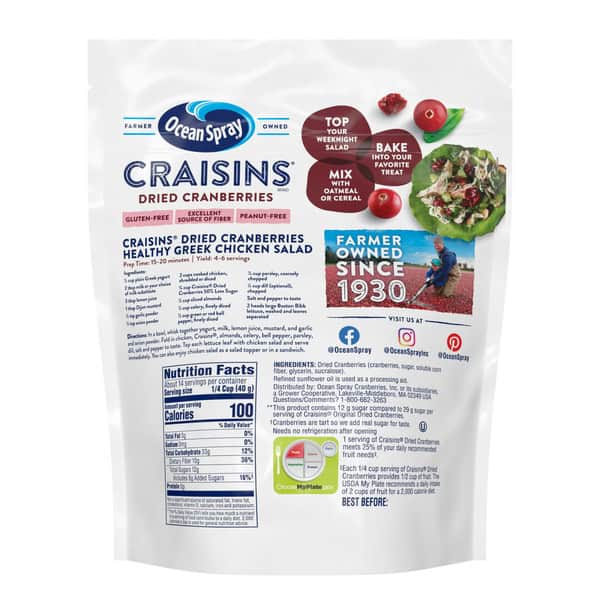 Mouth-watering flavor. 50% less sugar(1). Ocean Spray® Craisins® 50% Less Sugar Dried Cranberries. The cranberries you love, half the sugar(1) than the Original Craisins® Dried Cranberries. Enjoy the benefits of cranberry, even more. This cranberry dried fruit product is great for snacking, with only 100 calories per serving. An easy way to work in 25% of your daily recommended fruit needs(2). No artificial flavors or preservatives. Enjoy real, bold dried cranberries in every dried fruit pouch. Potent little puckers that are peanut-free, gluten-free and judgment-free. Top your weeknight salads. Mix them in your oatmeal or cereal. Use as baking ingredients in your favorite treats, like chewy dried cranberry oatmeal chocolate chunk cookies. Step up your entertaining game by adding their powerful flavor and color to apps, charcuterie boards and more. Transform boring lunches and dinners into mic-dropping meals – from chicken salad and gourmet grilled cheeses to Crockpot curry, beef stew, and even Taco Tuesdays. It’s true. They’re surprisingly delicious on tacos and in guacamole. Can raisins do all that? Nope. They’re also just really good on their own. However you use them, don’t let anything stand in the way of your Ocean Spray® Craisins® fix. We even made the bags resealable so you have fresh access and endless options. Keep sealed in a dry place to keep dried cranberries plump and fresh for longer. Ocean Spray believes in the power of the mighty cranberry; Born Tart. Raised Bold.â„¢