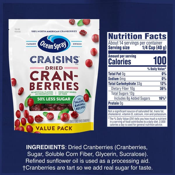 • One (1) 20 oz resealable value pack pouch of Ocean Spray® Craisins® 50% Less Sugar Dried Cranberries