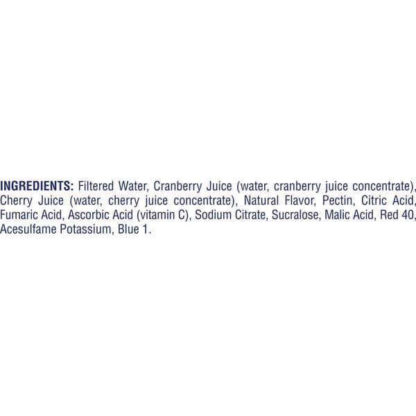 Filtered Water, Cranberry Juice (water, Cranberry Juice Concentrate), Cherry Juice (water, Cherry Juice Concentrate), Natural Flavor, Pectin, Citric Acid, Fumaric Acid, Ascorbic Acid (vitamin C), Sodium Citrate, Sucralose, Malic Acid, Red 40, Acesulfame Potassium, Blue 1