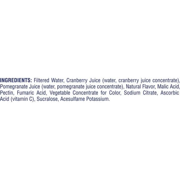 Filtered Water, Cranberry Juice (water, Cranberry Juice Concentrate), Pomegranate Juice (water, Pomegranate Juice Concentrate), Natural Flavor, Malic Acid, Pectin, Fumaric Acid, Vegetable Concentrate For Color, Sodium Citrate, Ascorbic Acid (vitamin C), Sucralose, Acesulfame Potassium.