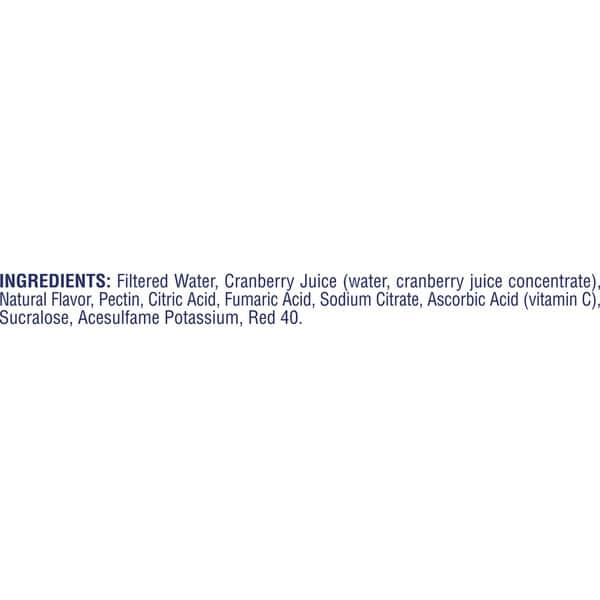Filtered Water, Cranberry Juice (water, Cranberry Juice Concentrate), Natural Flavor, Pectin, Citric Acid, Fumaric Acid, Sodium Citrate, Ascorbic Acid (vitamin C), Sucralose, Acesulfame Potassium, Red 40