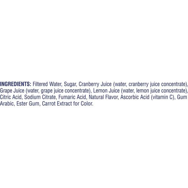 Filtered Water, Sugar, Cranberry Juice (water, Cranberry Juice Concentrate), Grape Juice (water, Grape Juice Concentrate), Lemon Juice (water, Lemon Juice Concentrate), Citric Acid, Sodium Citrate, Natural Flavor, Fumaric Acid, Ascorbic Acid (vitamin C), Gum Arabic, Carrot Extract For Color, Ester Gum