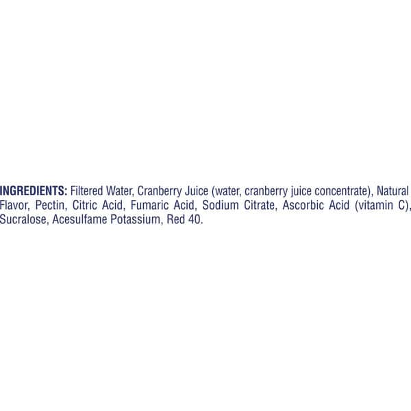 Filtered Water, Cranberry Juice (water, Cranberry Juice Concentrate), Natural Flavor, Pectin, Citric Acid, Fumaric Acid, Ascorbic Acid (vitamin C), Sodium Citrate, Sucralose, Acesulfame Potassium, Red 40.