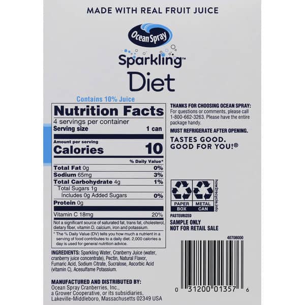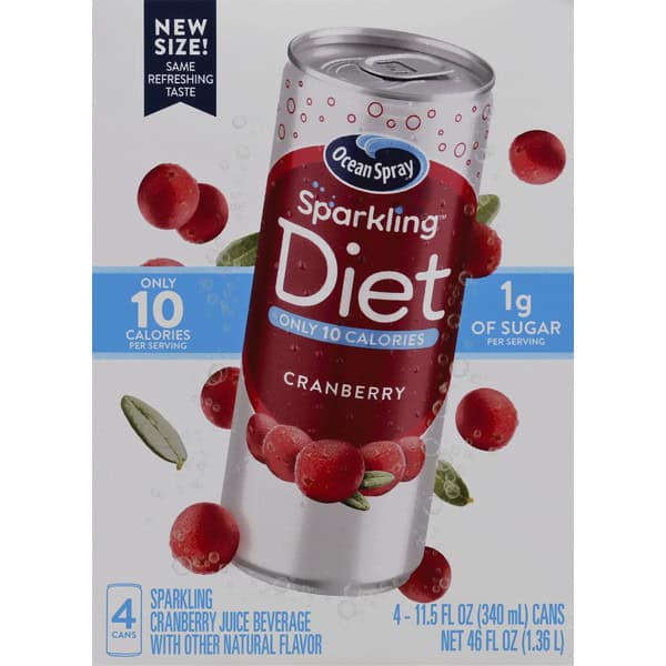 Crisp. Clean. Fizzy. Only 10 calories. Try Ocean Spray® Sparkling Diet Cranberry Juice Drink. A one-two punch of refreshment from real cranberry fruit juice and fizzy water for a diet drink full of flavor. This sparkling juice drink brings the flavor without compromise. It’s made without high fructose corn syrup, contains only 10 calories and even has vitamin C. Can other diet drinks say that? Use this sparkling cranberry juice drink as a cocktail mixer in your favorite beverages. Bring a chilled can with you to stay refreshed on the go. Sparkling Diet Cranberry Juice Drink is the perfect anytime beverage. All this made possible by the 700+ cranberry farming families that make up our co-op. Our owners. Our heartbeat. Our inspiration. Ocean Spray believes in the power of the mighty cranberry; Born Tart. Raised Bold.â„¢