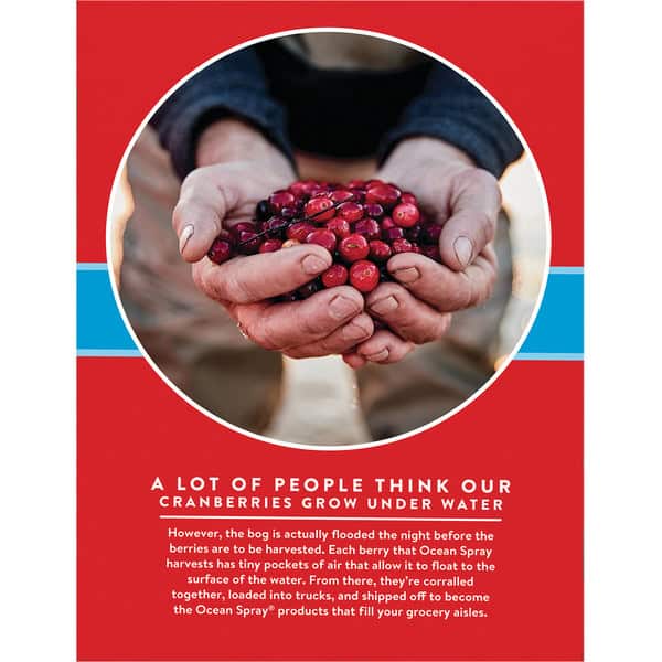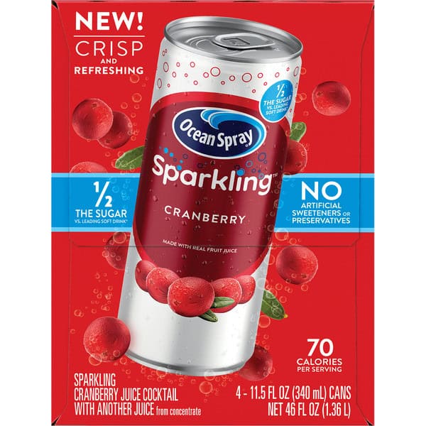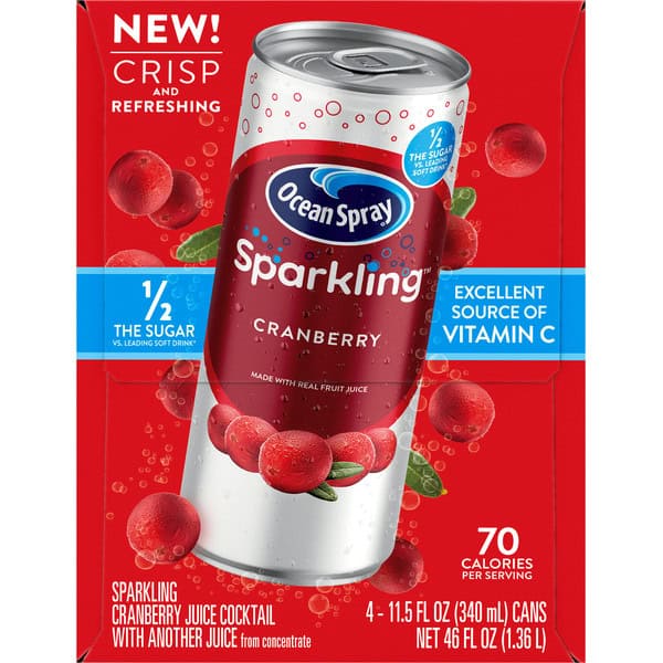 Sparkling cranberry juice cocktail with another juice from concentrate. 1/2 the sugar vs. the leading soft drink (this product contains 17 g sugar per 11.5 fl oz serving compared to 37 g sugar in 11.5 fl oz serving of the leading soft drink). 70 calories per serving. New! Crisp and refreshing. A lot of people think our cranberries grow under water. However, the bog is actually flooded the night before the berries are to be harvested. Each berry what Ocean Spray harvests has tiny pockets of air that allow it to float to the surface of water. From there, they’re corralled together, loaded into trucks, and shipped off to become the Ocean Spray products that fill your grocery aisles. Taste good for you! Pasteurized. No artificial sweeteners and preservatives. how2recycle.info Thanks for Choosing Ocean Spray: For questions or comments, please call 1-800-662-3263. Please have the entire package handy.