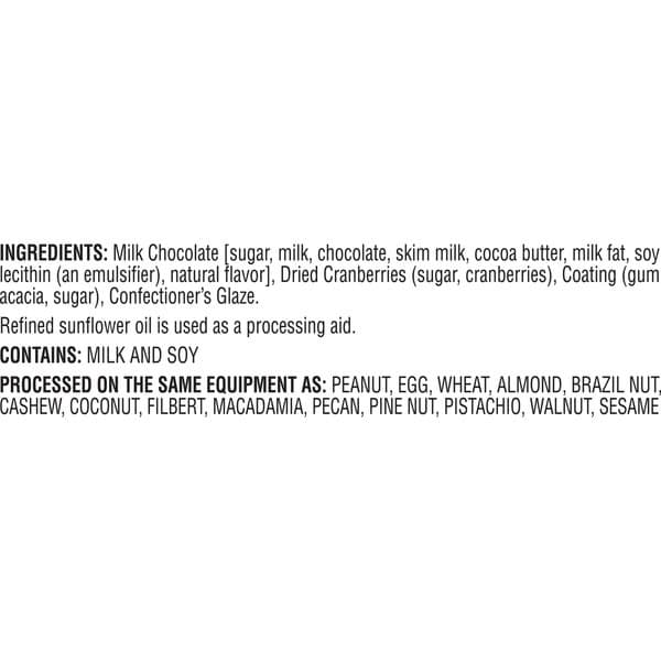 Milk Chocolate [sugar, Cocoa Butter, Milk, Chocolate Liquor, Soy Lecithin (an Emulsifier), And Vanilla], Sweetened Dried Cranberries (cranberries, Sugar), Coating (gum Acacia, Maltodextrin, And Sugar), Confectioner’s Glaze.