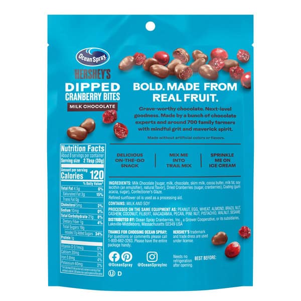 Snacking just got better. Ocean Spray® HERSHEY’S® Milk Chocolate Dipped Cranberry Bites. Dive into the fruit-full world of sweetened dried cranberries now dipped in HERSHEY’S® smooth milk chocolate goodness. This dried fruit is the perfect chocolate snack. Real, bold dried cranberries dipped in smooth milk chocolate in every dried fruit pouch. Enjoy as on the go snacks. Stash in your desk drawer. Share with friends and family. Or…don’t. Stay in. Cozy up on that couch. Sprinkle over your favorite ice cream. And dig in. You and your taste buds deserve it. Step up your entertaining game by adding their bold flavor to apps, charcuterie boards and more. They’re also just really good on their own. However you use them, don’t let anything stand in the way of your Ocean Spray® HERSHEY’S® Milk Chocolate Dipped Cranberry Bites fix. Keep sealed in a dry place to keep these dried cranberry bites fresh for longer. Ocean Spray believes in the power of the mighty cranberry; Born Tart. Raised Bold.â„¢