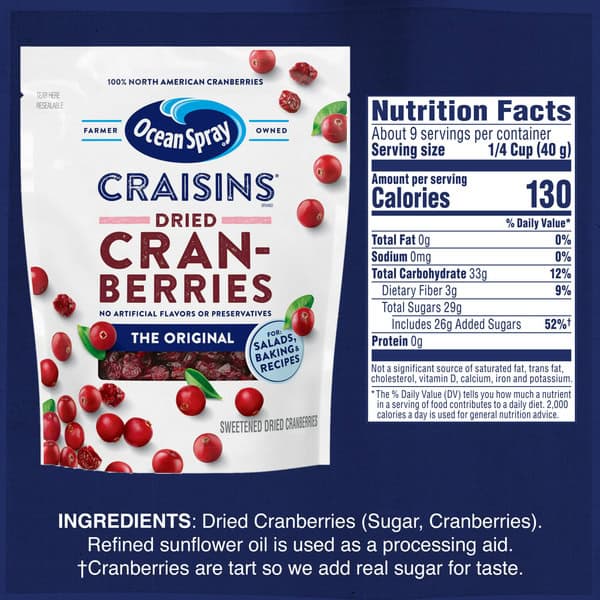 • Ocean Spray® Craisins® Original Dried Cranberries have no artificial flavors or preservatives, only bold flavor