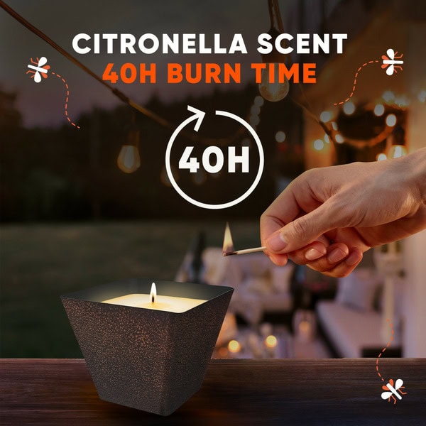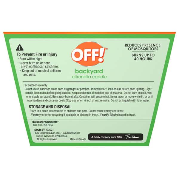 Don’t let mosquitoes spoil your special outdoor time. Be proactive, so that mosquitoes are repelled well before your good times begin. OFF!® Citronella Candle gives all your outdoor occasions the ambiance and gentle glow they deserve. This scented oil candle can be re-lit for continuous use and burns for up to 40 hours, reducing the presence of mosquitoes. These candles are perfect for pre-back yard, pre-hosting and pre-relaxing. This OFF!® Citronella Candle works just like a normal candle and makes the perfect centerpiece. Take back your space and keep living life your way with a decorative outdoor candle that creates an inviting atmosphere. Use on your tabletop, deck or patio.