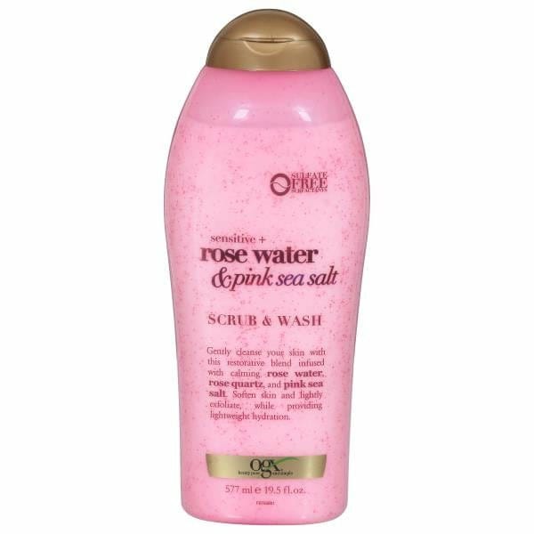 • OGX Rosewater & Pink Sea Salt Wash & Scrub gently exfoliates to reveal softer, more supple skin