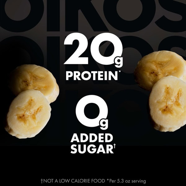 Go Pro with Oikos Pro Banana Yogurt-Cultured Ultra-Filtered Milk Product, the spoonable high protein snack with more of what you want, and less of what you don’t. Every serving contains 0g added sugar* and nine essential amino acids, in addition to vitamin D and calcium for strong bones. Each Oikos Pro snack cup packs a punch with 20g of protein per serving, so you can always have dependable, high protein snacks to help you add more protein to your day. Because when you feel strong, you are unstoppable. With protein and deliciousness, these healthy snacks for adults can help you strive to reach your potential with every serving. Pack a banana snack cup for days that start at a sprint and enjoy a delicious boost of protein at lunch. Each snack cup leaves room for toppings, so throw in your favorite fruit for an extra refreshing snack. Need 0g added sugar,* 0 artificial sweeteners, and 0% fat? Try Oikos Triple Zero with 15g of protein per serving. Want the creamy one with the fruit pieces? Oikos Blended has you covered. Oikos — Stronger Makes Everything Better (R). *Not a low-calorie food.