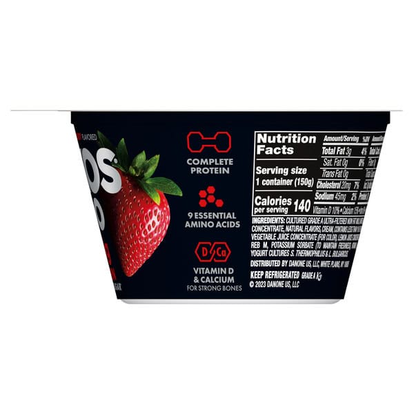 Go Pro with Oikos Pro Strawberry Yogurt-Cultured Ultra-Filtered Milk Product, the spoonable high protein snack with more of what you want, and less of what you don’t. Every serving contains 0g added sugar* and nine essential amino acids, in addition to vitamin D and calcium for strong bones. Each Oikos Pro snack cup packs a punch with 20g of protein per serving, so you can always have dependable, high protein snacks to help you add more protein to your day. Because when you feel strong, you are unstoppable. With protein and deliciousness, these healthy snacks for adults can help you strive to reach your potential with every serving. Pack a strawberry snack cup for days that start at a sprint and enjoy a delicious boost of protein at lunch. Each snack cup leaves room for toppings, so throw in your favorite fruit for an extra refreshing snack. Need 0g added sugar,* 0 artificial sweeteners, and 0% fat? Try Oikos Triple Zero with 15g of protein per serving. Want the creamy one with the fruit pieces? Oikos Blended has you covered. Oikos — Stronger Makes Everything Better (R). *Not a low-calorie food.