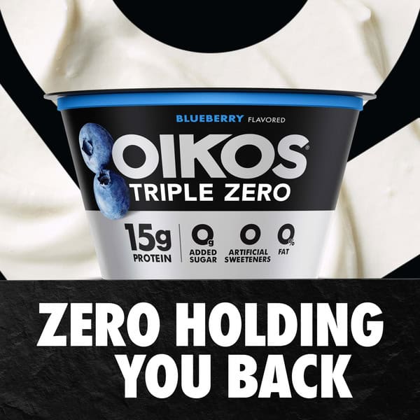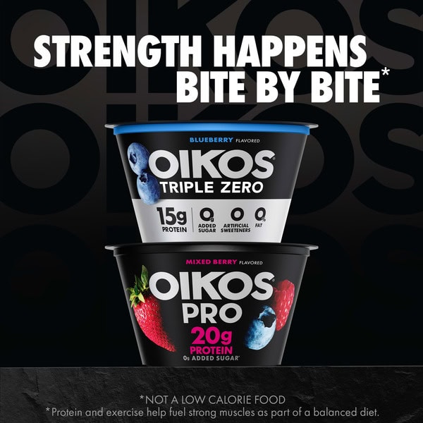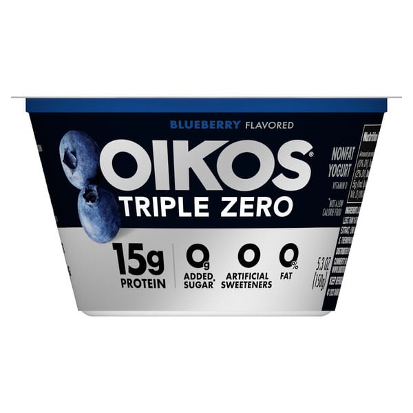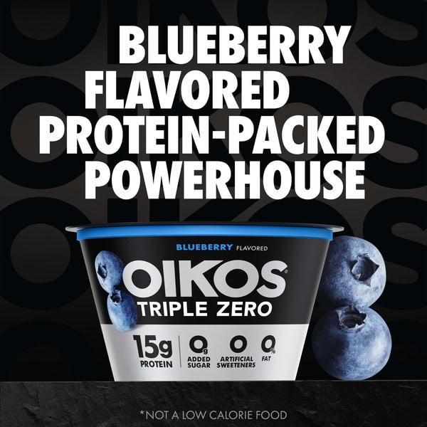• STRONGER MAKES EVERYTHING BETTER: One 5.3 oz cup of Oikos Triple Zero Blueberry Nonfat Greek Yogurt