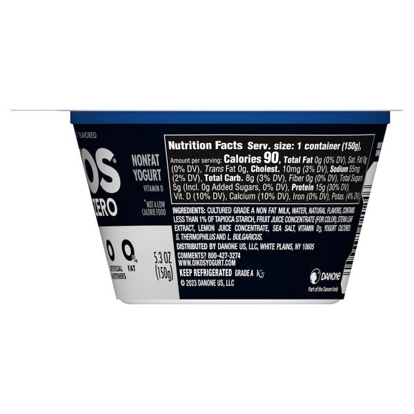 Enjoy epic tastes with Oikos Triple Zero Nonfat Blueberry Greek Yogurt, the delicious nonfat Greek yogurt cup with more of what you want and less of what you don’t. Each Oikos Triple Zero yogurt cup contains 0% fat, 0g added sugar* per 5.3 oz serving and 0 artificial sweeteners. Our blueberry flavored Greek yogurt packs a punch with 15 grams of protein, so you can always have dependable, high protein snacks with zero holding you back. Because when you feel strong, you are unstoppable. With protein and deliciousness, this Greek nonfat yogurt can help you strive to reach your potential with every serving. Pack a yogurt Greek cup for days that start at a sprint and enjoy a delicious boost of protein at lunch. Or throw in your favorite fruit or toppings for an extra refreshing snack. For even more reasons to go Greek, try Oikos Pro snack cups with 20g of protein per serving or Oikos Blended with chunks of real fruit. Oikos Greek yogurt — Stronger Makes Everything Better (R). *Not a low-calorie food.