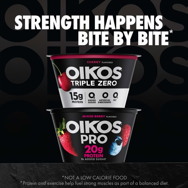 Enjoy epic tastes with Oikos Triple Zero Nonfat Cherry Greek Yogurt, the delicious nonfat Greek yogurt cup with more of what you want and less of what you don’t. Each Oikos Triple Zero yogurt cup contains 0% fat, 0g added sugar* per 5.3 oz serving and 0 artificial sweeteners. Our cherry flavored Greek yogurt packs a punch with 15 grams of protein, so you can always have dependable, high protein snacks with zero holding you back. Because when you feel strong, you are unstoppable. With protein and deliciousness, this Greek nonfat yogurt can help you strive to reach your potential with every serving. Pack a yogurt Greek cup for days that start at a sprint and enjoy a delicious boost of protein at lunch. Or throw in your favorite fruit or toppings for an extra refreshing snack. For even more reasons to go Greek, try Oikos Pro snack cups with 20g of protein per serving or Oikos Blended with chunks of real fruit. Oikos Greek yogurt — Stronger Makes Everything Better (R). *Not a low-calorie food.