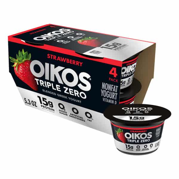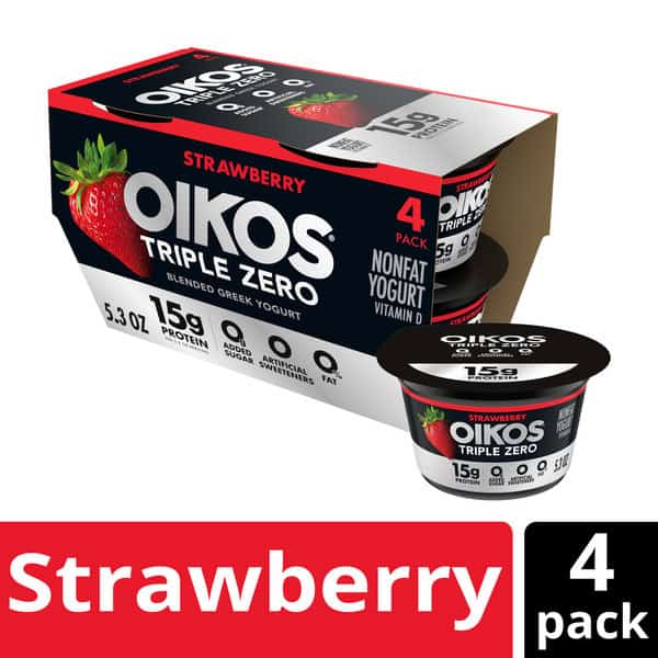 • STRONGER MAKES EVERYTHING BETTER: Four 5.3 oz cups of Oikos Triple Zero Strawberry Nonfat Greek Yogurt