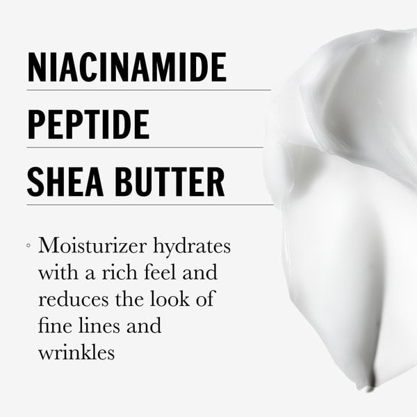 Water, Glycerin, Niacinamide*, Isohexadecane, Zea Mays (corn) Starch, Dimethicone, Isopropyl Isostearate, Stearyl Alcohol, Butyrospermem Parkii (shea) Butter**, Panthenol***, Cetyl Alcohol, Palmitoyl Pentapeptide-4^, Hydroxyacetophenone, C13-14 Isoparaffin, Dimethiconol, Laureth-7, Cetearyl Glucoside, Cetearyl Alcohol, Stearic Acid, Palmitic Acid, Behenyl Alcohol, Disodium Edta, Polyacrylamide, Peg-100 Stearate, Phenoxyethanol, *vitamin B3, **shea Butter, ***pro-vitamin B5, ^peptide